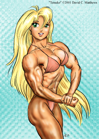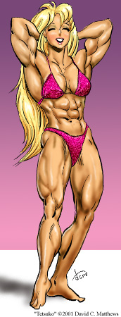 The following five pictures were commissioned by the owner of a (now sadly defunct) Japanese website, "Muscle Beauty". He loved the idea of a manga/anime style muscle-woman as the "mascot" of his site, but wanted me to "tone down" the mass and muscularity with which I was already (circa 2001) endowing Tet-chan. ...So if you're a fan of a sleeker "fitness" or lightweight-bodybuilder physique, you might like these.